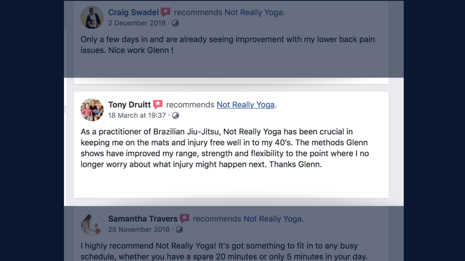 "As a student of yoga for 20 years and a number of years as a teacher I have been part of many yoga classes. Glenn's Not Really Yoga is unique and provides the often missing link between yoga and exercise off the mat. "
